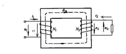 單相變壓器有兩個(gè)線圈共同繞在一個(gè)閉合鐵芯上,如右圖所示,其中與電源相連的線圈稱(chēng)為原邊線圈,與原邊線圈相關(guān)的各量的標(biāo)示符號(hào)均在右下角標(biāo)注以角碼1,如U1、I1等,與負(fù)載項(xiàng)鏈的線圈稱(chēng)為副邊線圈,相關(guān)度額各量的標(biāo)示符號(hào)均在右下角標(biāo)注角碼2,如U2、I2等。